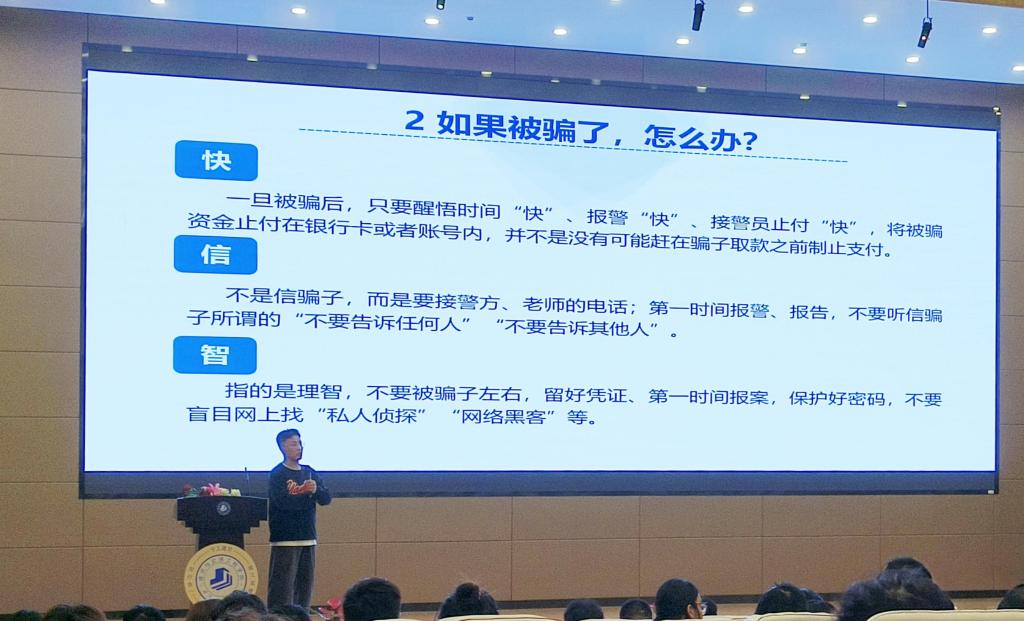 一旦受骗,钱款追回难度非常大,邵老师提醒同学们要严防电信网络诈骗:牢记“六个一律”和“八个凡是”诈骗识别公式;践行“快、信、智”原则,可疑情况及时联系学校保卫处、辅导员或拨打110;及时安装“国家反诈中心APP”。