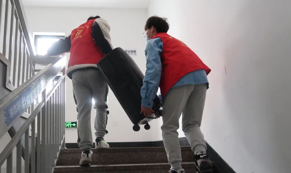 下午一点,学生党员志愿者就已身穿红色志愿服在岗位上严阵以待。他们整装待发地在寝室楼下关注着路上是否有来接送学生的巴士,一旦有学生下车,学生党员志愿者就会立刻走上前去帮忙搬运行李,并且帮助同学将行李搬上楼。
