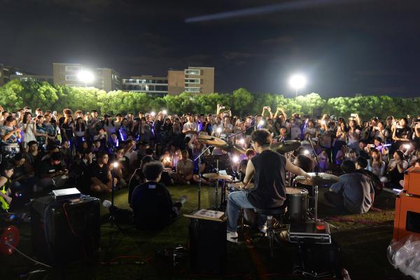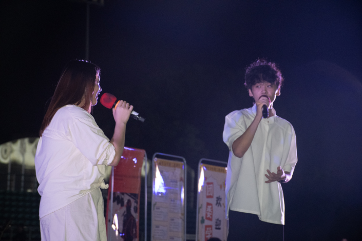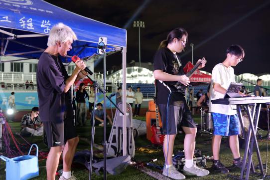 紧接着,离散乐队携乐器登台。主唱略带沙哑的嗓音响起,《离歌》的深情旋律缓缓流淌,《搁浅的人》则风格一转,激昂的鼓点与电吉他旋律交织,唱出对梦想的执着与坚守,乐队成员全情投入的表演,让台下观众沉浸在摇滚音乐的独特氛围中,不少人跟着节奏轻轻摇摆身体。在热烈的音乐氛围后,尚声的朱丽雲、颜肇翔带来抒情歌曲《命运》。两人默契配合,女声温柔细腻、男声低沉深情,歌声在夜空下缓缓回荡,将歌曲中对命运的思考与情感的细腻展现得淋漓尽致。